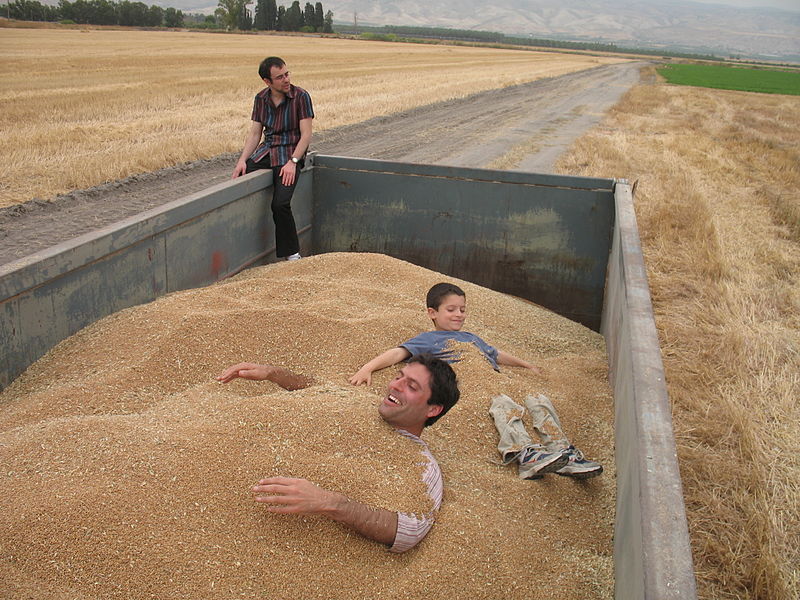 A family plays inside a container of newly harvested wheat in the Bet Shean Valley, northern Israel.