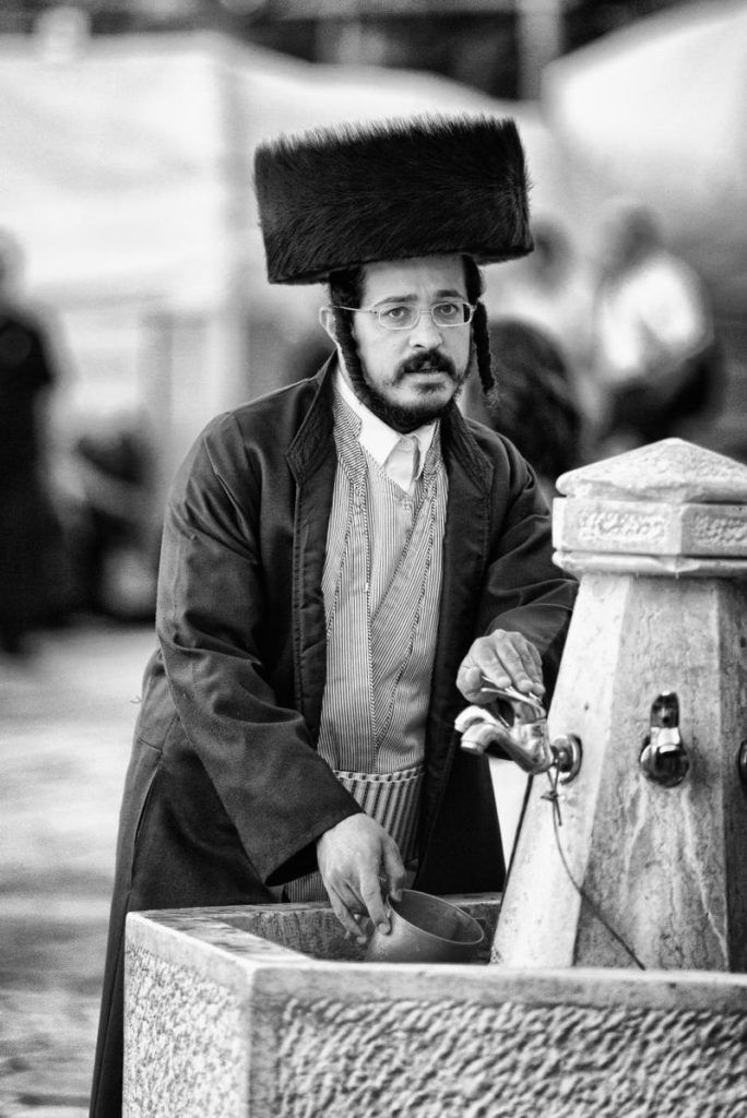 A Hasidic man washed his hands with a washing cup prior to praying at the Western Wall in Jerusalem. The same ritual is performed prior to eating bread.