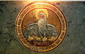 The modern church of Dominus Flevit is built upon the foundations of an earlier Byzantine church which faced east. Extensive remains of the ancient mosaic floor of this 7th century monastery church are still visible. The Greek dedication inscription reads: “Simon, friend of Christ, who built and decorated this place of prayer and offered it to Christ our Lord in expiation of his sins…”