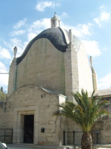 The present church on this site dates to the 1950s and was designed by the celebrated Italian architect Antonio Barluzzi who is responsible for many other Franciscan churches in the Holy Land. Barluzzi strove to have the form of each church he designed reflect the essence of the relevant Scriptural passage commemorated. Accordingly, Domius Flevit is a small chapel with a high pointed dome that is meant to evoke the shape of a tear, a reference to weeping of Jesus that happened on this site.
